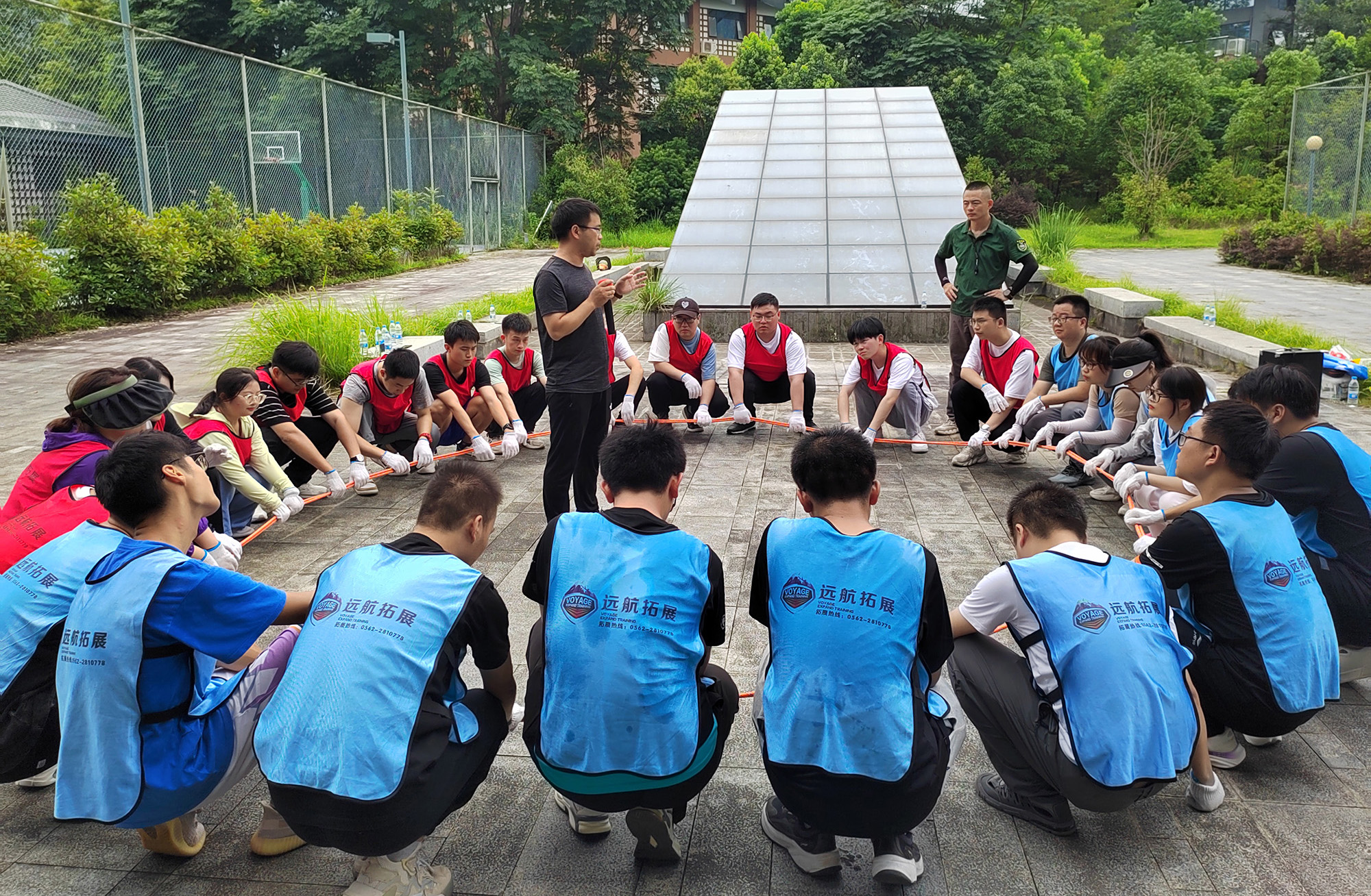 拓展培訓(xùn)活動在教練的專業(yè)指導(dǎo)下有序進(jìn)行:新入職大學(xué)生分為2個小組,由組長牽頭合作創(chuàng)建了屬于自己的團(tuán)隊(duì),為各自的團(tuán)隊(duì)設(shè)計(jì)隊(duì)名、隊(duì)歌、隊(duì)旗及口號,并共同完成瘋狂市場、急速60秒、雙解碼及生命動力圈等一系列活動。