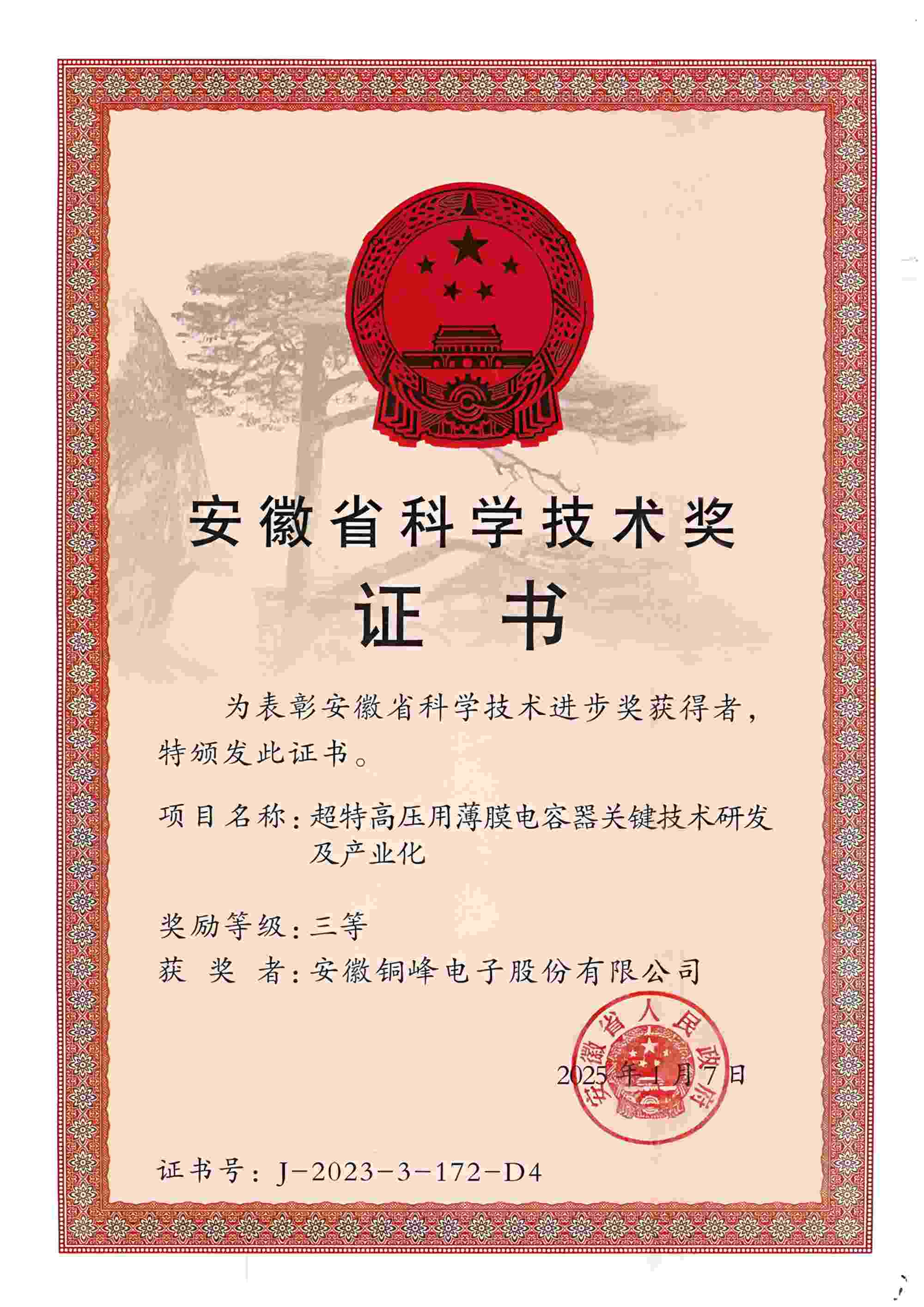 5月12日上午,安徽省科技創(chuàng)新大會召開,隆重表彰2023年度安徽省科學(xué)技術(shù)獎勵獲獎人員和組織。公司與國網(wǎng)安徽省電力有限公司、國網(wǎng)智能電網(wǎng)研究院有限公司、西安交通大學(xué)等單位聯(lián)合完成的“超特高壓用薄膜電容器關(guān)鍵技術(shù)研發(fā)及產(chǎn)業(yè)化項目”榮獲安徽省科技進(jìn)步三等獎。
