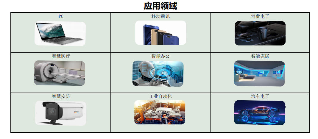 產(chǎn)品廣泛應(yīng)用于:3C(計算機、通訊、消費電子)、智慧醫(yī)療、智能辦公、智能家居、智慧安防、物聯(lián)網(wǎng)、工業(yè)自動化及汽車電子等領(lǐng)域,靈活滿足全球不同客戶的差異化需求以及快速創(chuàng)新的追求。